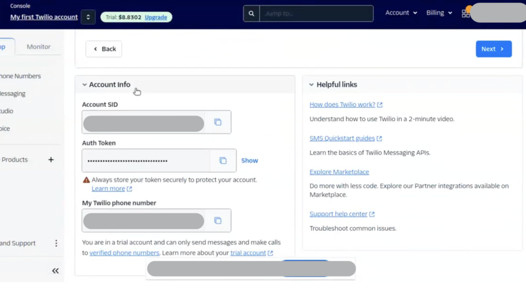 3. Pega el Account SID y el Auth Token en sus respectivos campos.