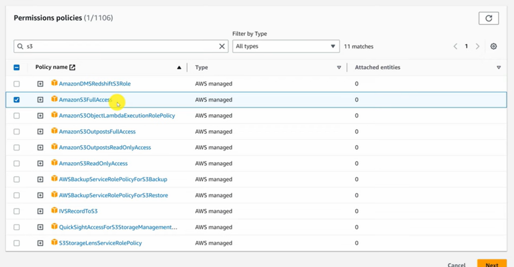 • En el buscador de políticas, escribe s3 y selecciona la casilla de AmazonS3FullAccess.